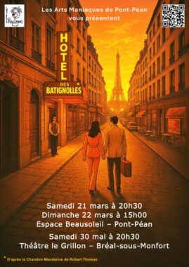 Et enfin les 21 et 22 mars Hôtel des Batignolles à Pont Péan et le 30 mai à Bréal